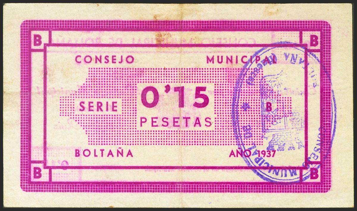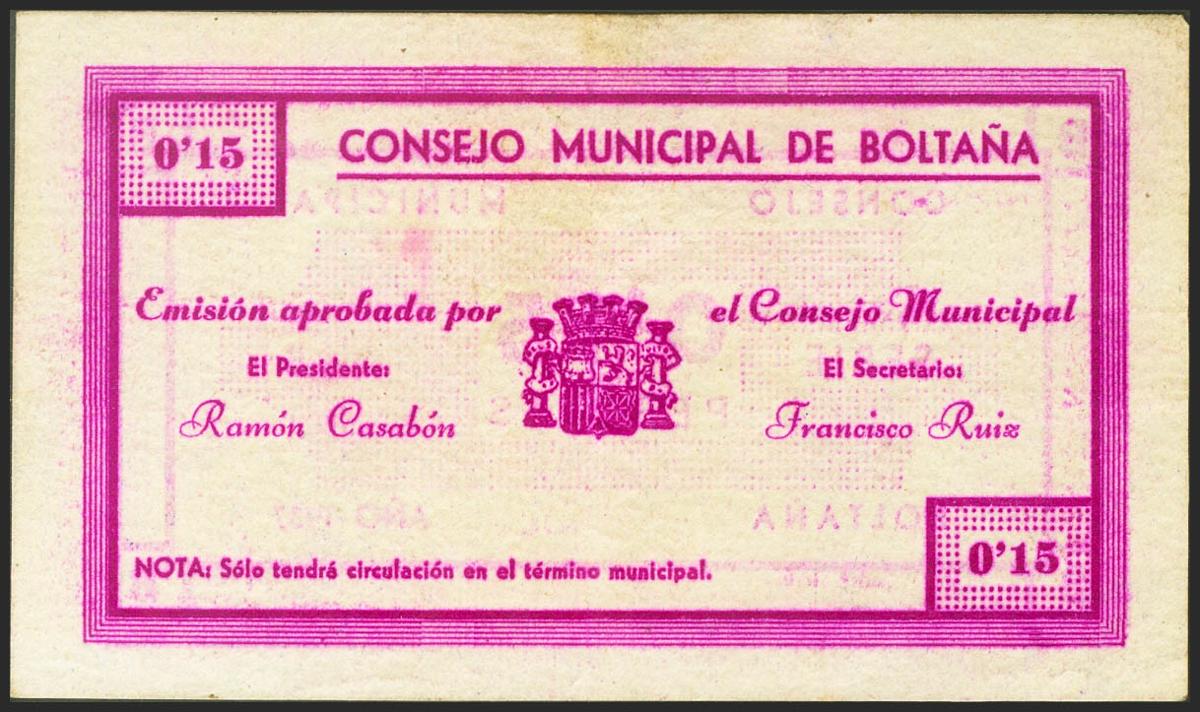 BOLTAÑA (HUESCA). 15 cents. (1937ca). Series B. (González: 1267). Rare. Good Very Fine.