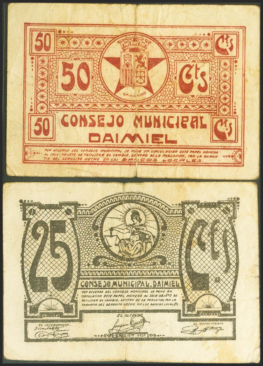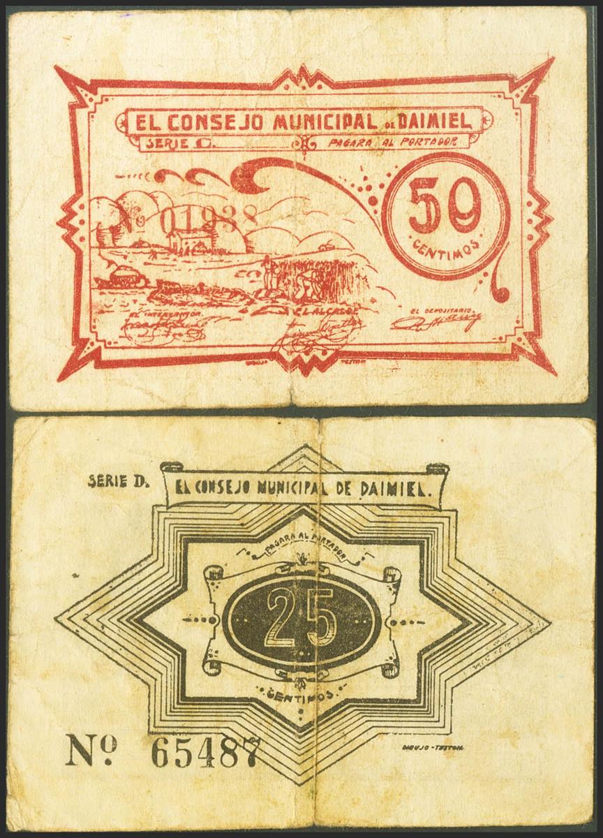 English DAIMIEL (REAL CITY). 25 cents and 50 cents. (1937ca). Series D and C, respectively. (González: 2175, 2176). unusual. Very Fine/ Fine.