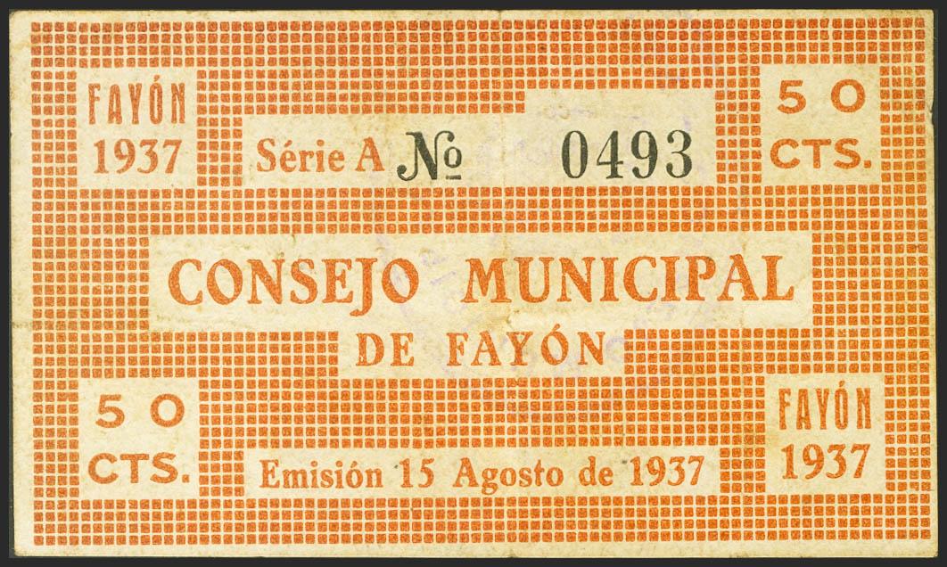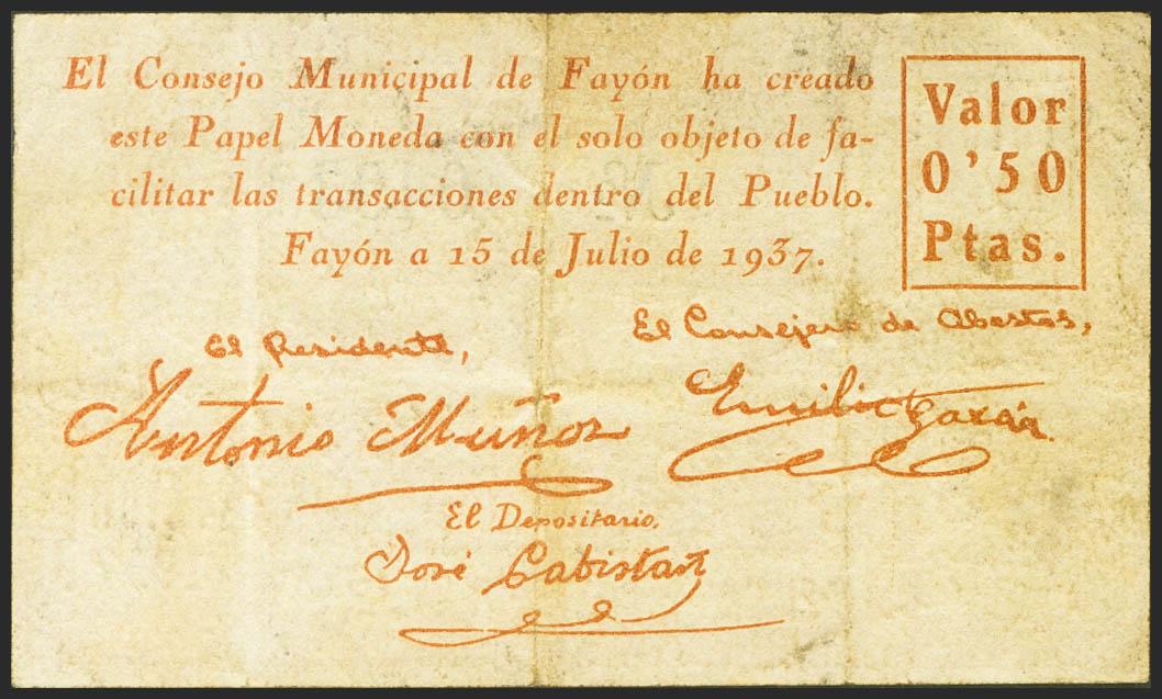 English FAYON (ZARAGOZA). 50 cents. August 15, 1937. Series A. (González: 2420). Rare. Good Very Fine.