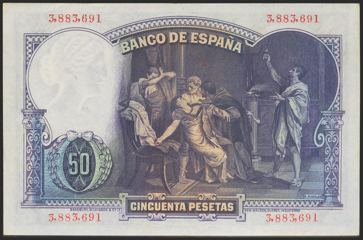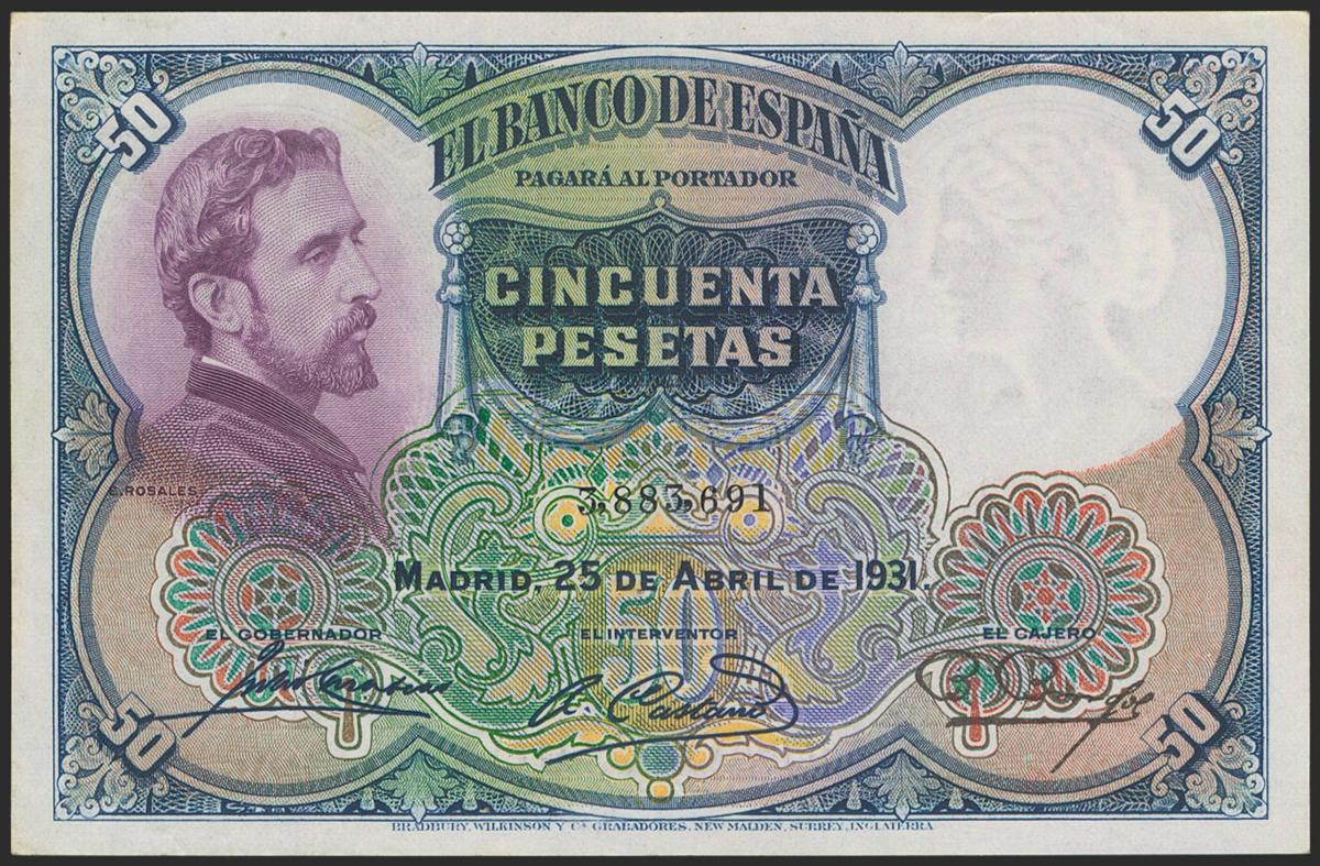50 pesetas. April 25, 1931. No series. (Edifil 2021: 359). Very attractive. Retains much of the original sizing. Good Extremely Fine.