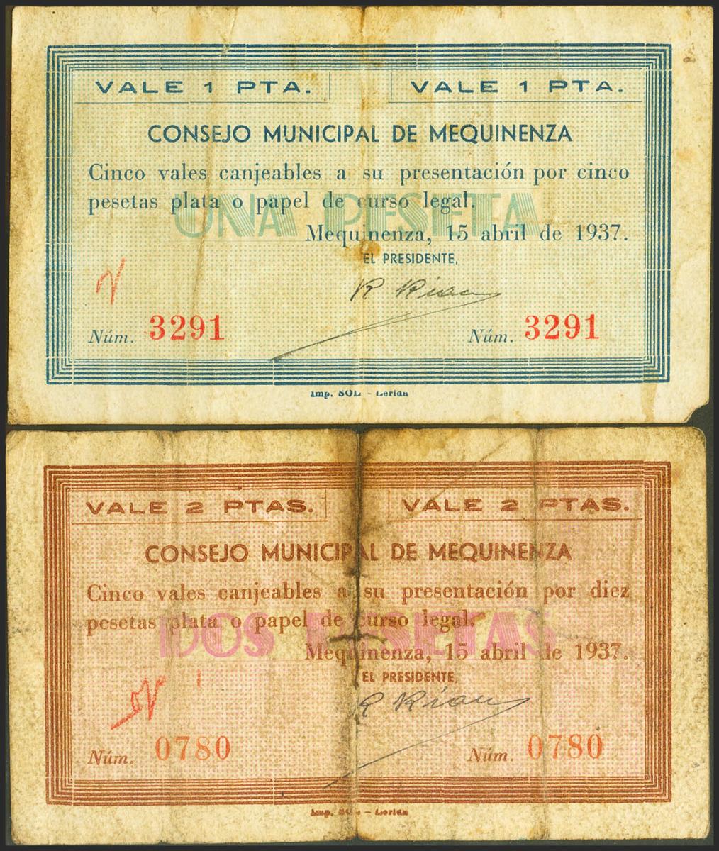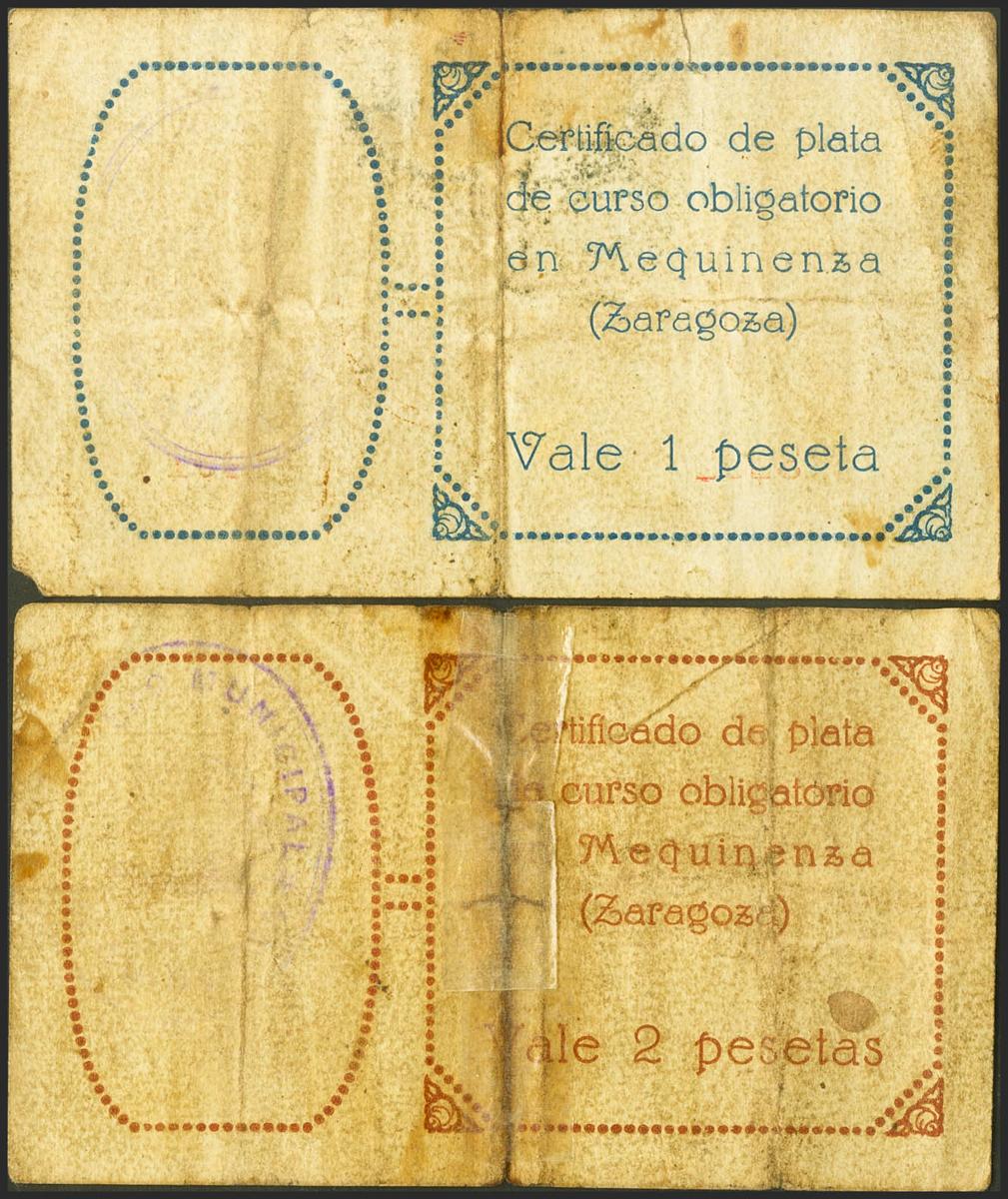 English MEQUINENZA (ZARAGOZA). 1 Peseta and 2 Pesetas. April 15, 1937. (González: 3494, 3495). Rare, presence of adhesive tape. Almost Fine.