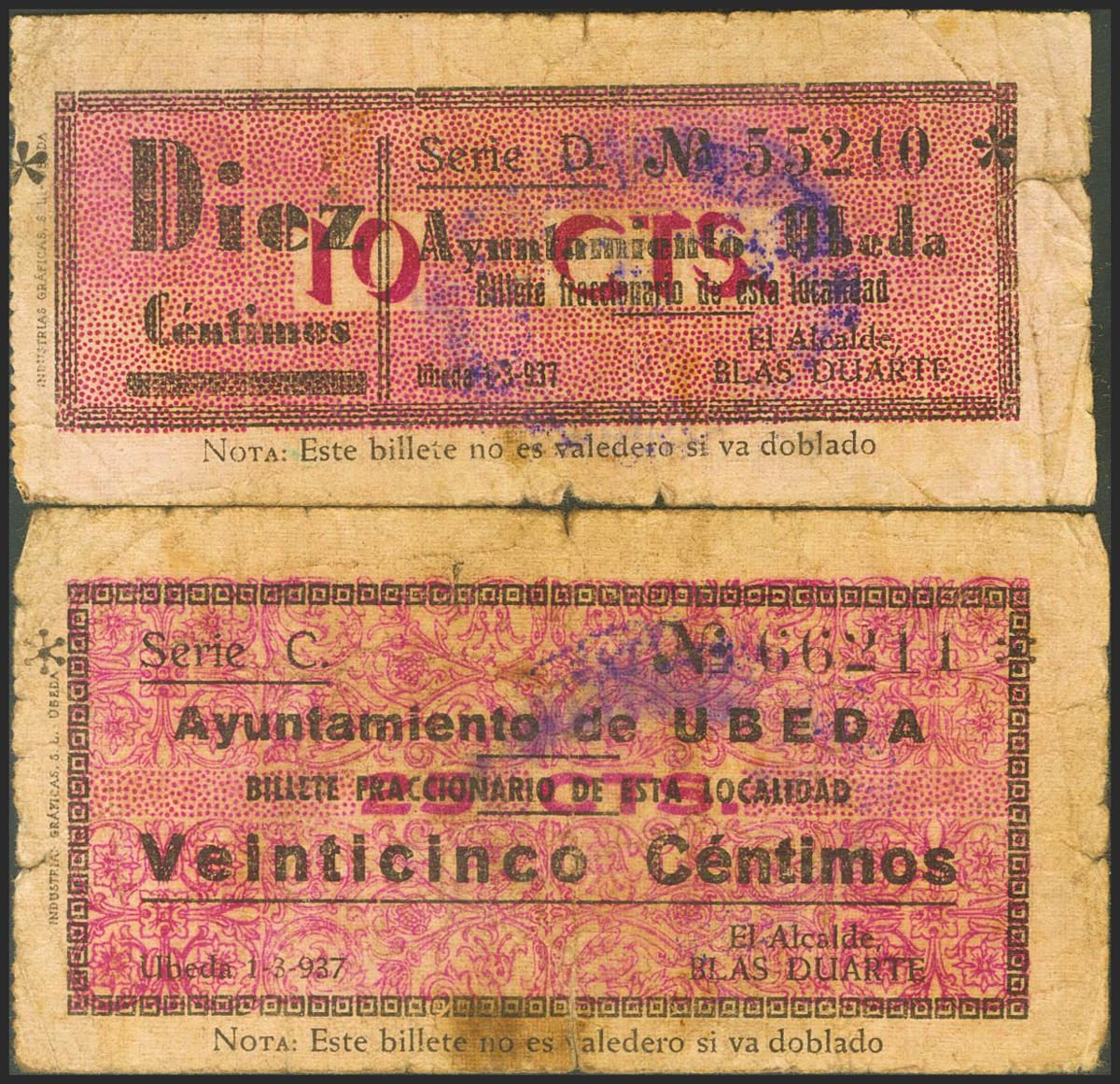 UBEDA (JAEN). 10 cents and 25 cents. March 1, 1937. Series D and C, respectively. (Gonzalez: 5193, 5194). unusual. Almost Fine.