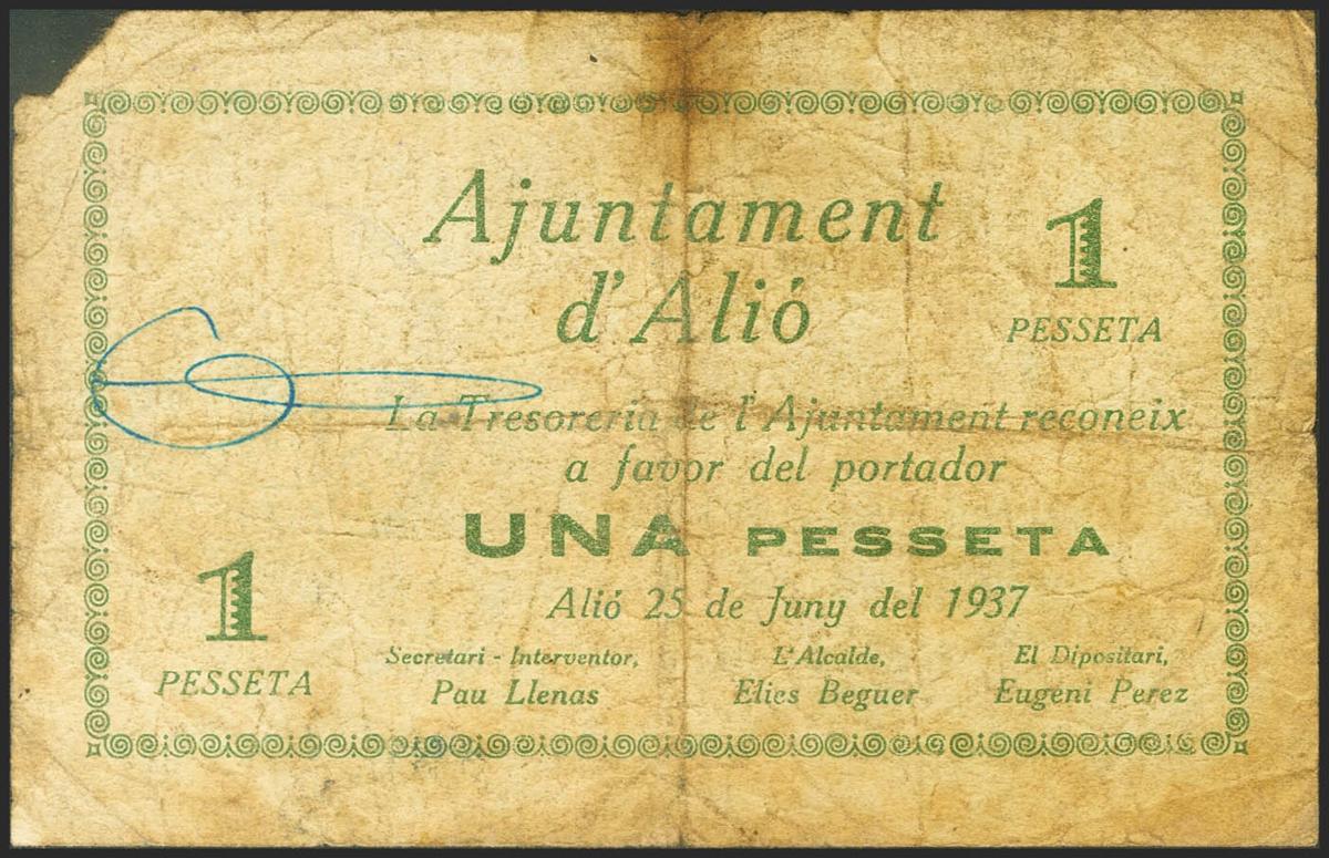 English ALIO (TARRAGONA). 1 Peseta. June 25, 1937. Series A. (González: 6202). Rare. Fine.