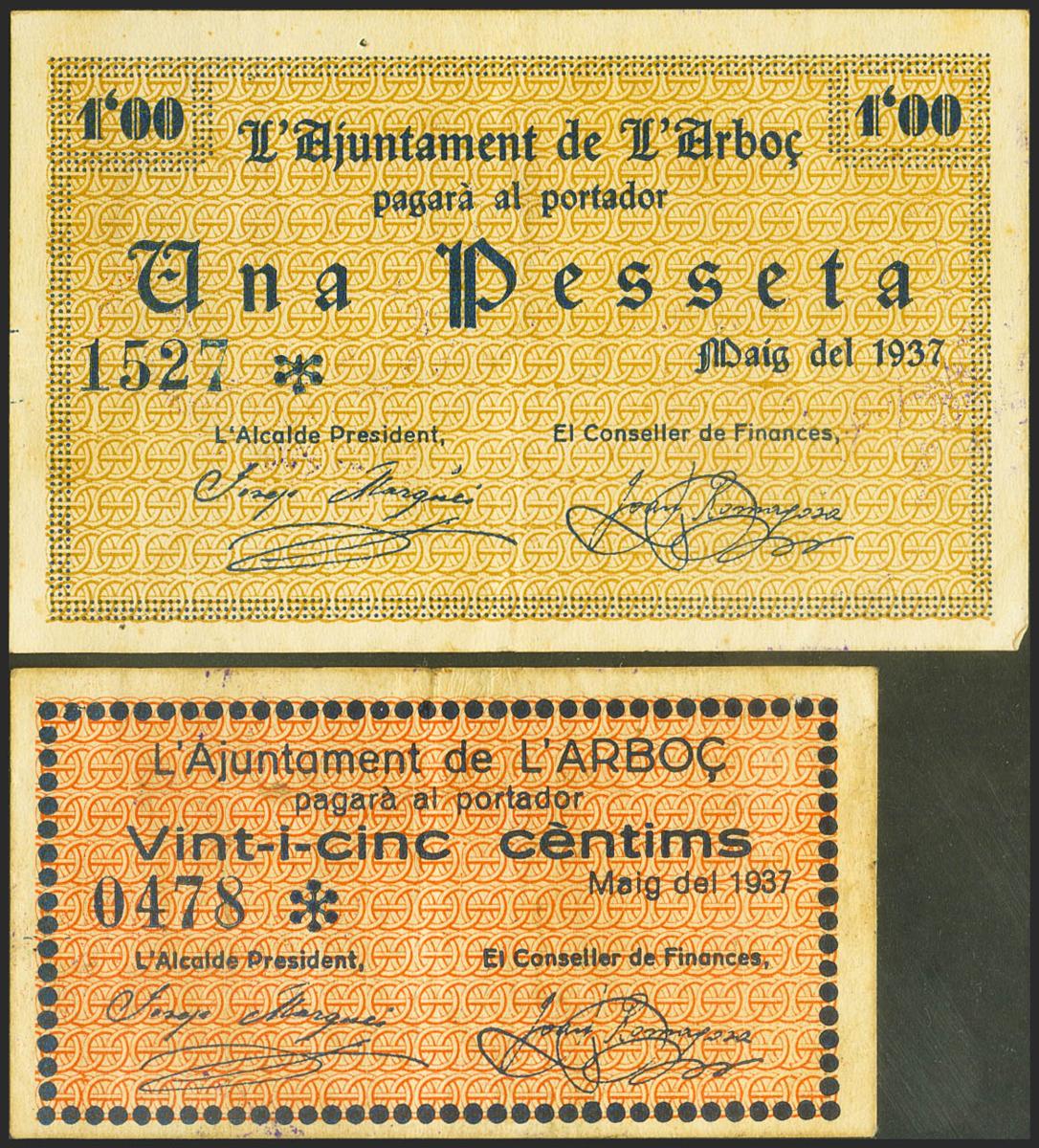 English L´ARBOÇ (TARRAGONA). 25 Cents and 1 Peseta. May 1937. (González: 6314, 6316). Very Fine.