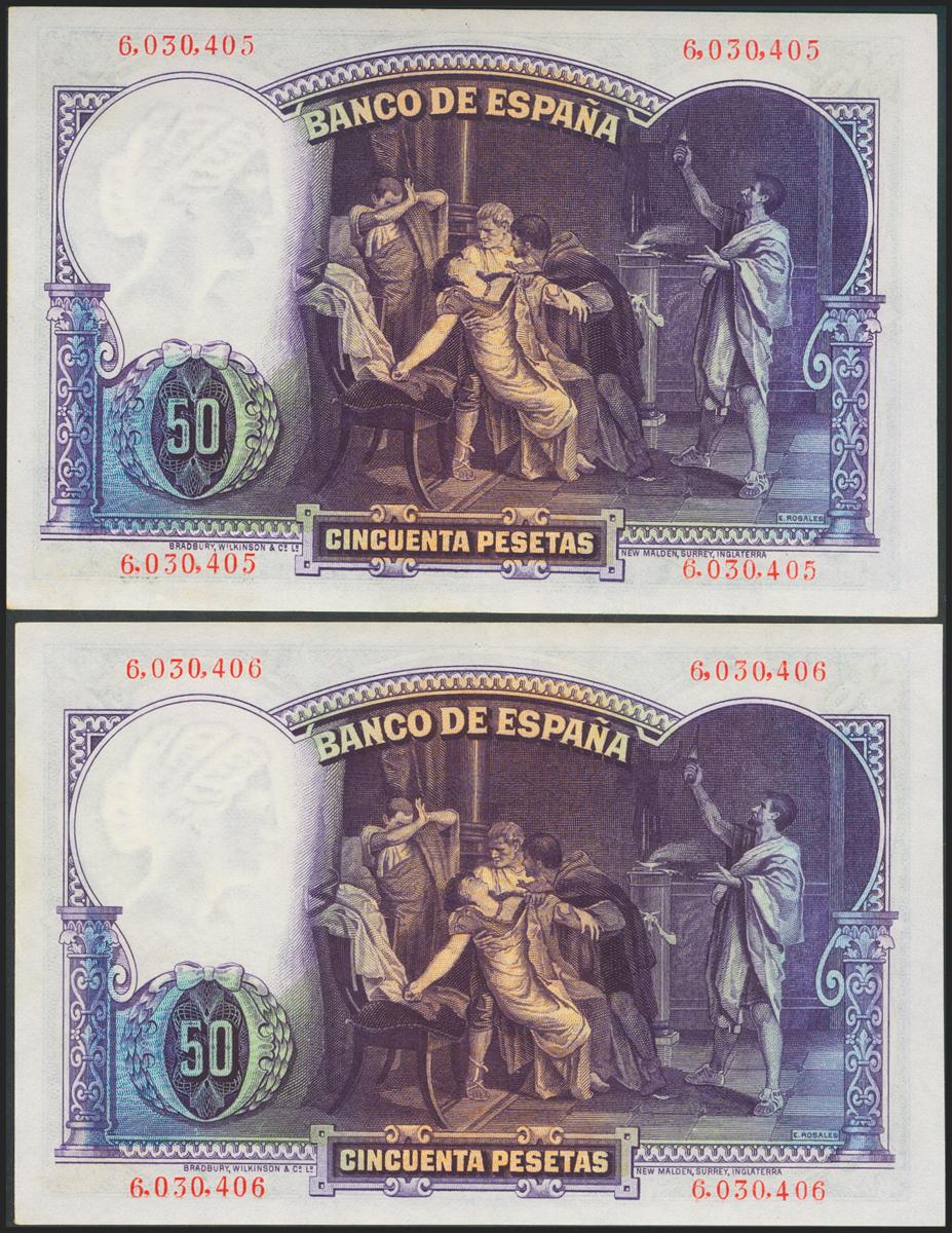 50 pesetas. April 25, 1931. Correlative couple. No serie. (Edifil 2021: 359). Hugely attractive pair, retains much of the original sizing. Good Extremely Fine/ Extremely Fine.