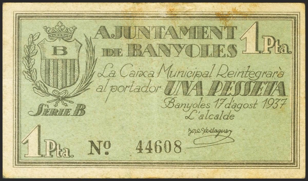 BANYOLES (GERONA). 1 Peseta. August 17, 1937. Series B. (González: 6507). Very Fine.