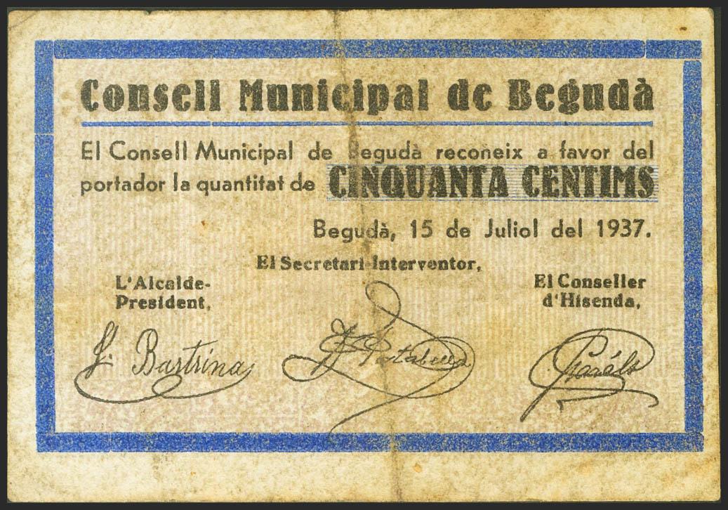 English BEGUDA (GERONA). 50 cents. July 15, 1937. Series B. (González: 6926). Very Fine.