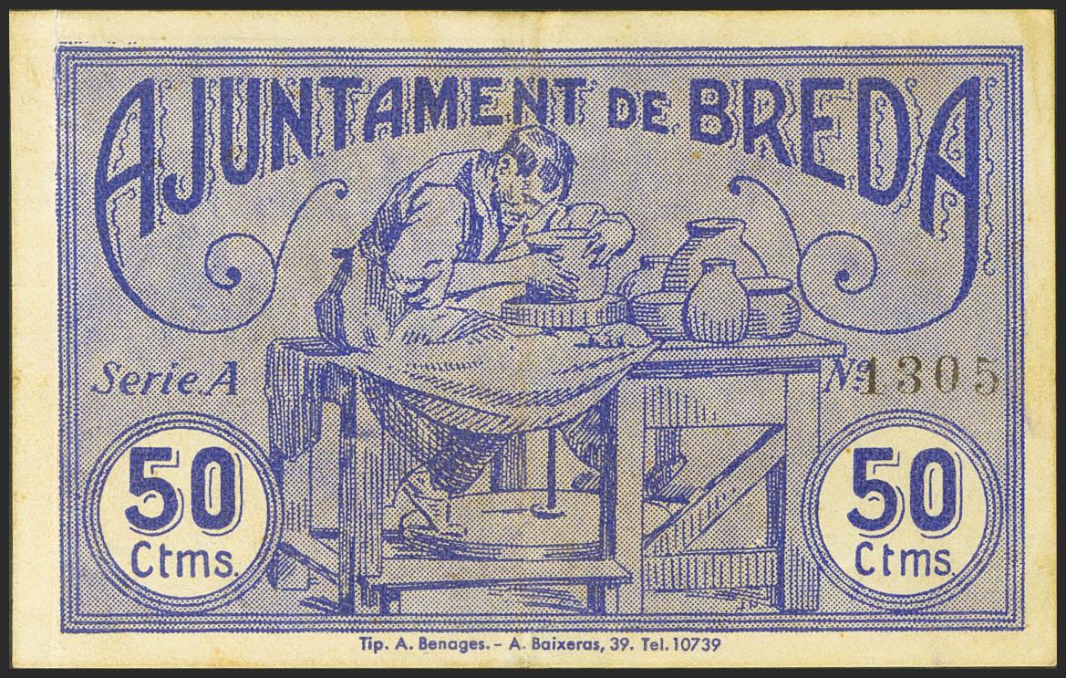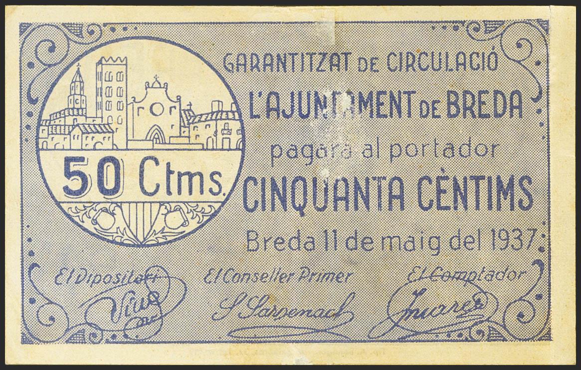 English BREDA (GIRONA). 50 cents. May 11, 1937. Series A. (González: 7200). Unusual. Good Fine.