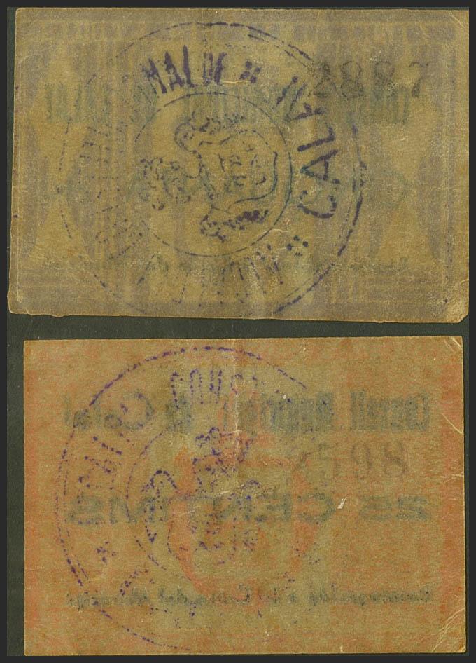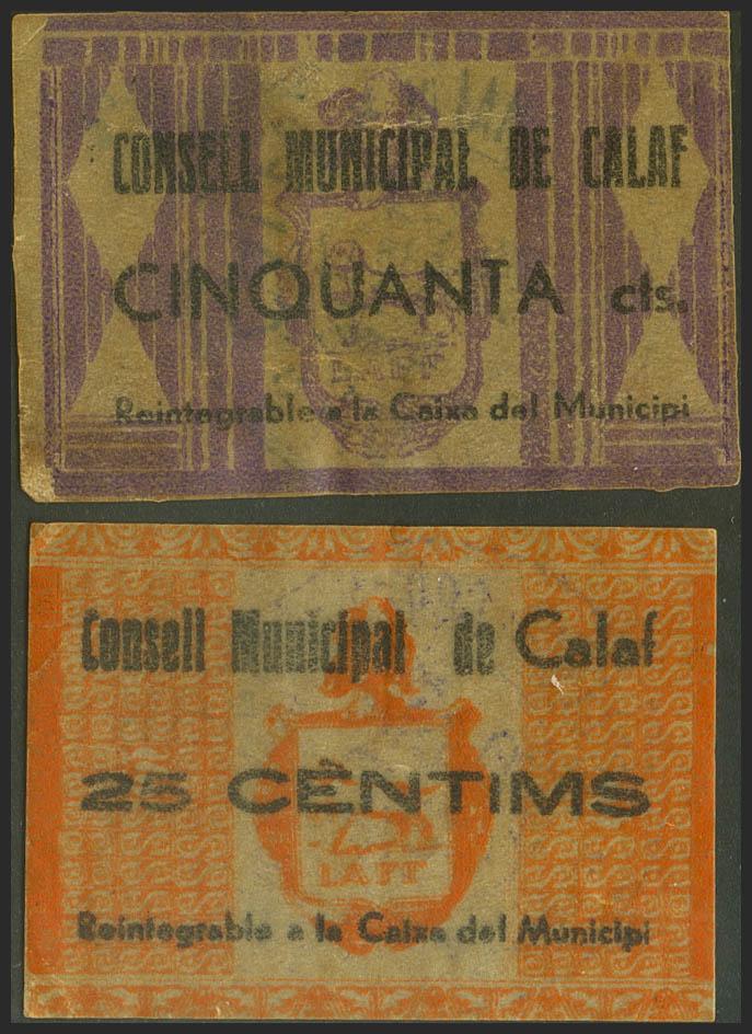English CALAF (BARCELONA). 25 Cents and 1 Peseta. (1937ca). (Gonzalez: 7261, 7263). rare. Good Very Fine.
