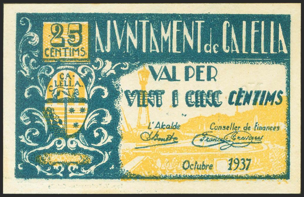 CALELLA (BARCELONA). 25 cents. October 1937. Series A. (González: 7290). Original sizing. Uncirculated.