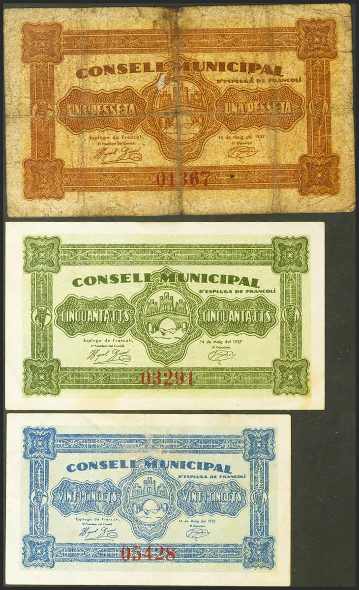 English ESPLUGA FROM FRANCOLI (TARRAGONA). 25 Cents, 50 Cents and 1 Peseta. May 14, 1937. (González: 7771/73). Complete series. Extremely Fine/ Good.