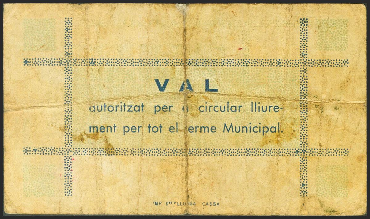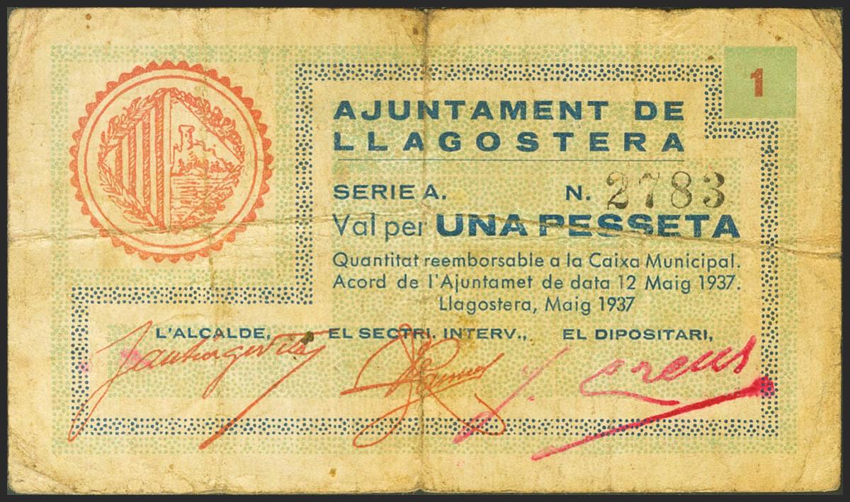LLAGOSTERA (GERONA). 1 Peseta. May 12, 1937. Series A. (González: 8335). Almost Very Fine.