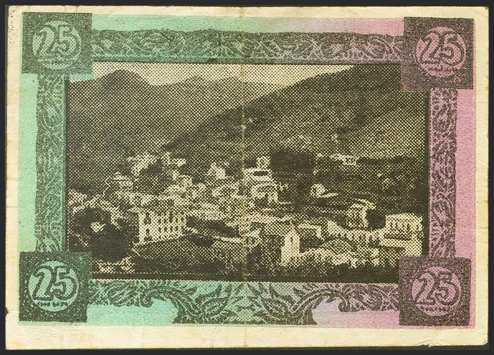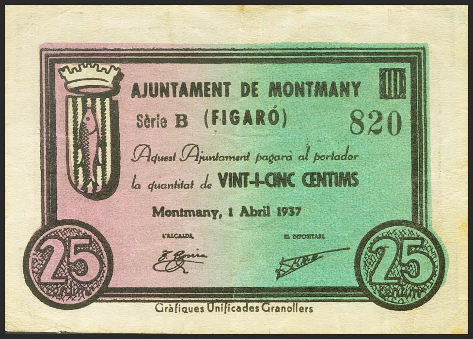 MONTMANY (BARCELONA). 25 cents. April 1, 1937. Series B. (González: 8800). Good Very Fine.