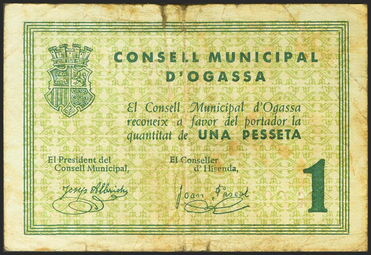 OGASSA (GERONA). 1 Peseta. June 1937. (González: 8918). Rare. Almost Very Fine.