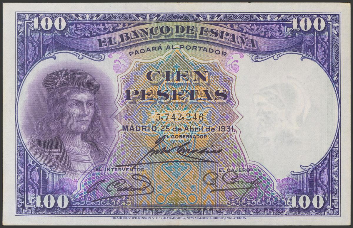 100 pesetas. April 25, 1931. No series. (Edifil 2017: 360). Retains much of the original sizing. Extremely Fine.