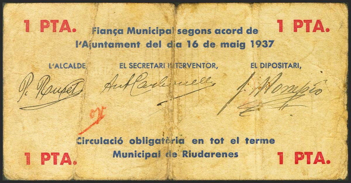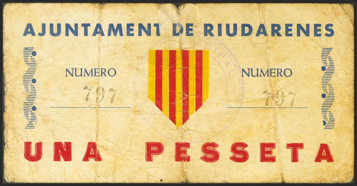 English RIUDARENES (GERONA). 1 Peseta. May 16, 1937. (González: 9670). Very rare. Almost Very Fine.