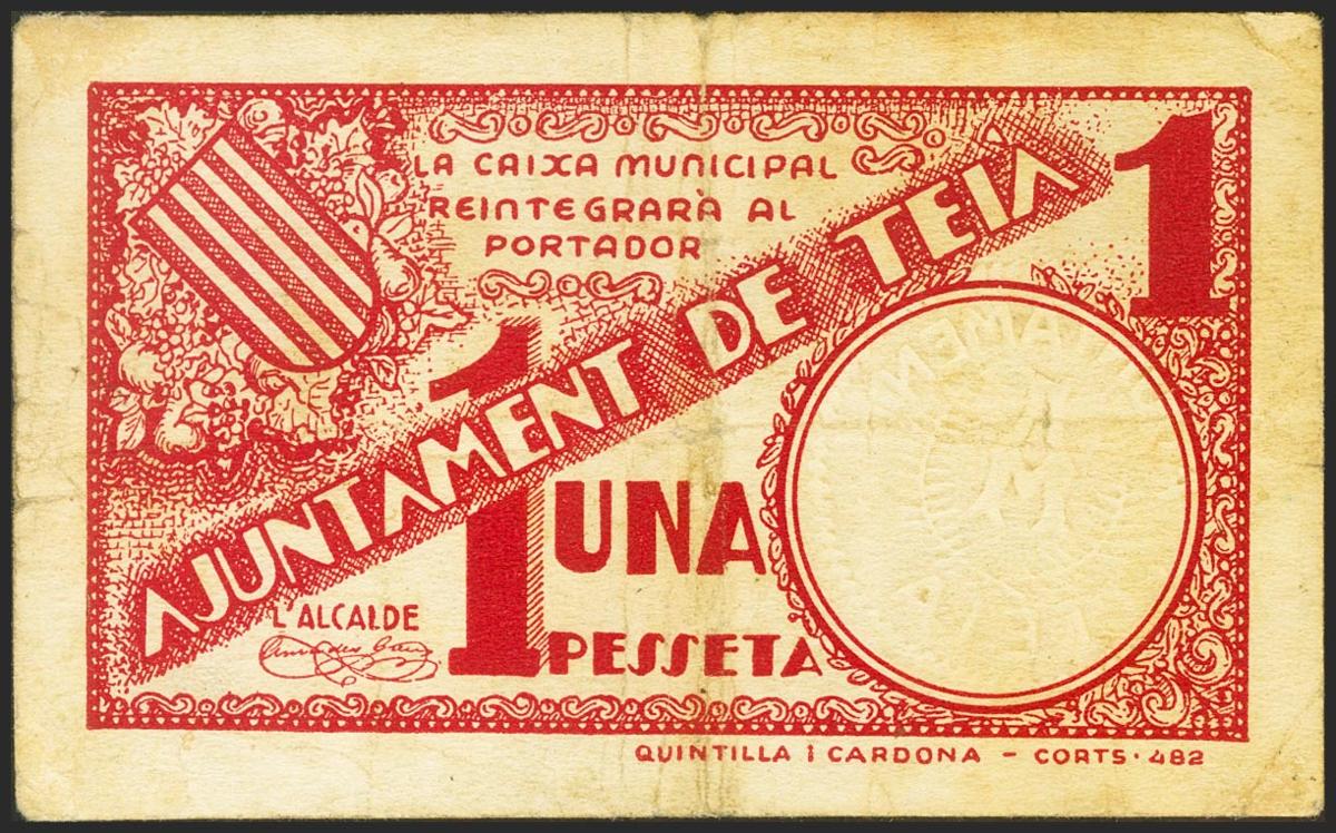 TEIA (BARCELONA). 1 Peseta. (1936ca). (Gonzalez: 10124). Unusual. Very Fine.