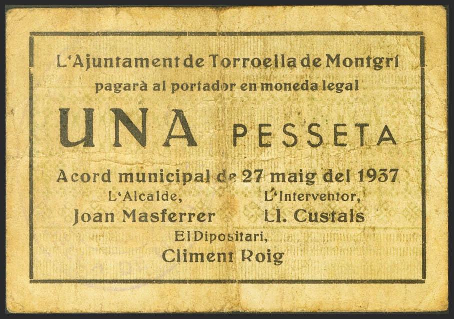 TORROELLA DE MONTGRI (GERONA). 1 Peseta. May 27, 1937. (González: 10393). Rare. Very Fine.