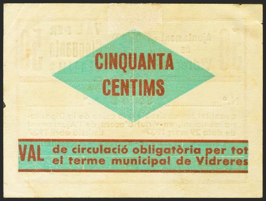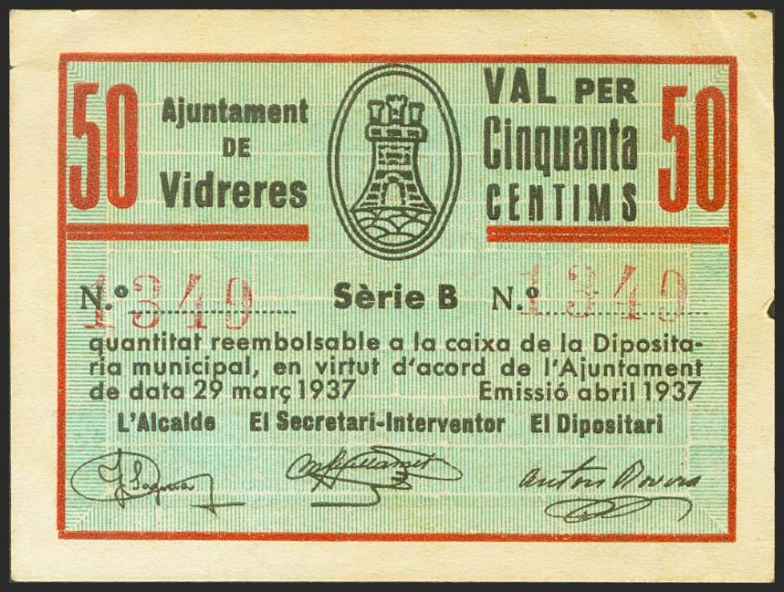 VIDRERES (GERONA). 50 cents. April 1937. Series B. (González: 10646). Rare. Extremely Fine.