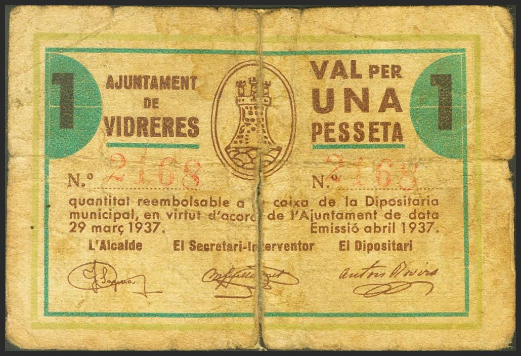 VIDRERES (GERONA). 1 Peseta. April 1937. (González: 10647). Presence of adhesive tape. Almost Fine.