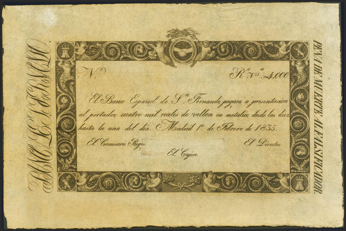 4000 Reales de Vellón. 1 de Febrero de 1835. Banco de San Fernando. Sin firmas. (Edifil 2021: 25a). Muy raro, apresto original, al dorso huella de cinta adhesiva sin importancia. SC-.