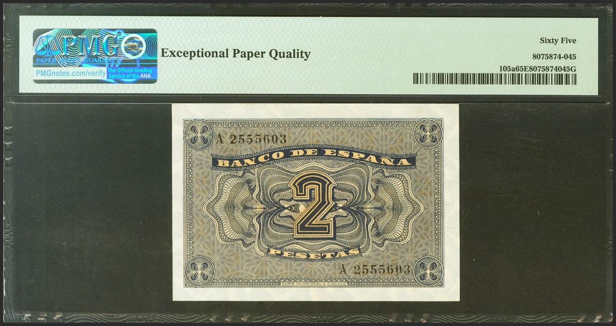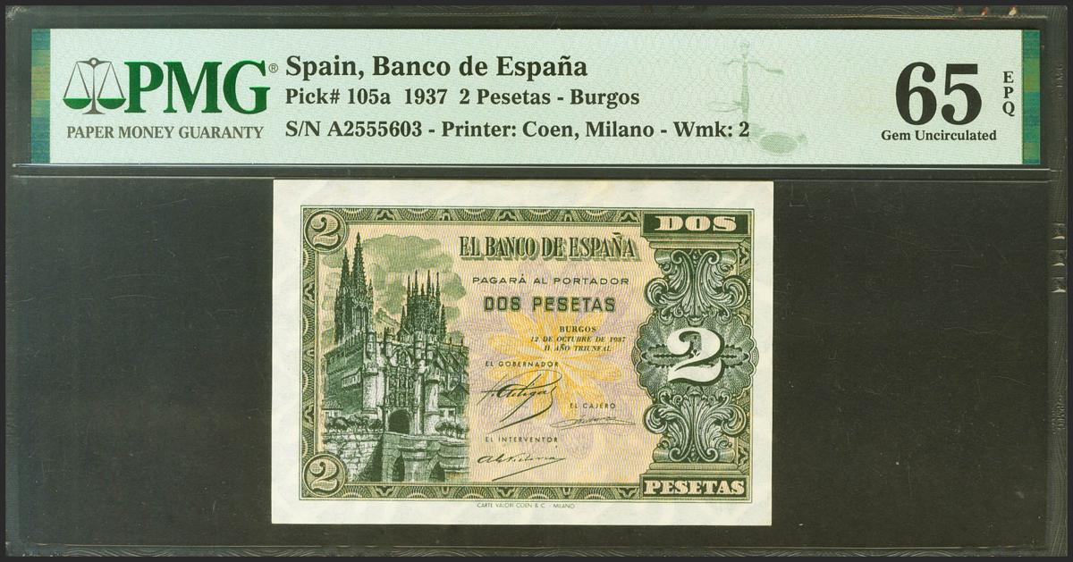 2 Pesetas. 12 de Octubre de 1937. Serie A. (Edifil 2021: 426, Pick: 105a). Inusual en esta excepcional calidad, apresto original. SC. Encapsulado PMG65EPQ.