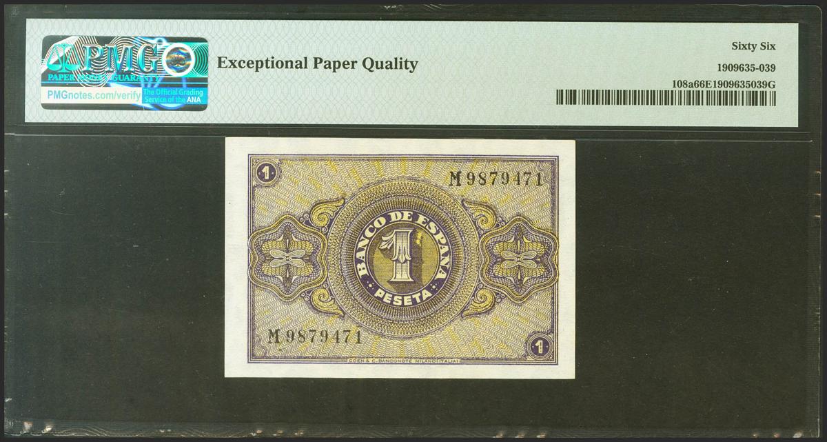 1 Peseta. 30 de Abril de 1938. Serie M. (Edifil 2021: 428a, Pick: 108a). Inusual en esta excepcional calidad, apresto original. SC. Encapsulado PMG66EPQ.