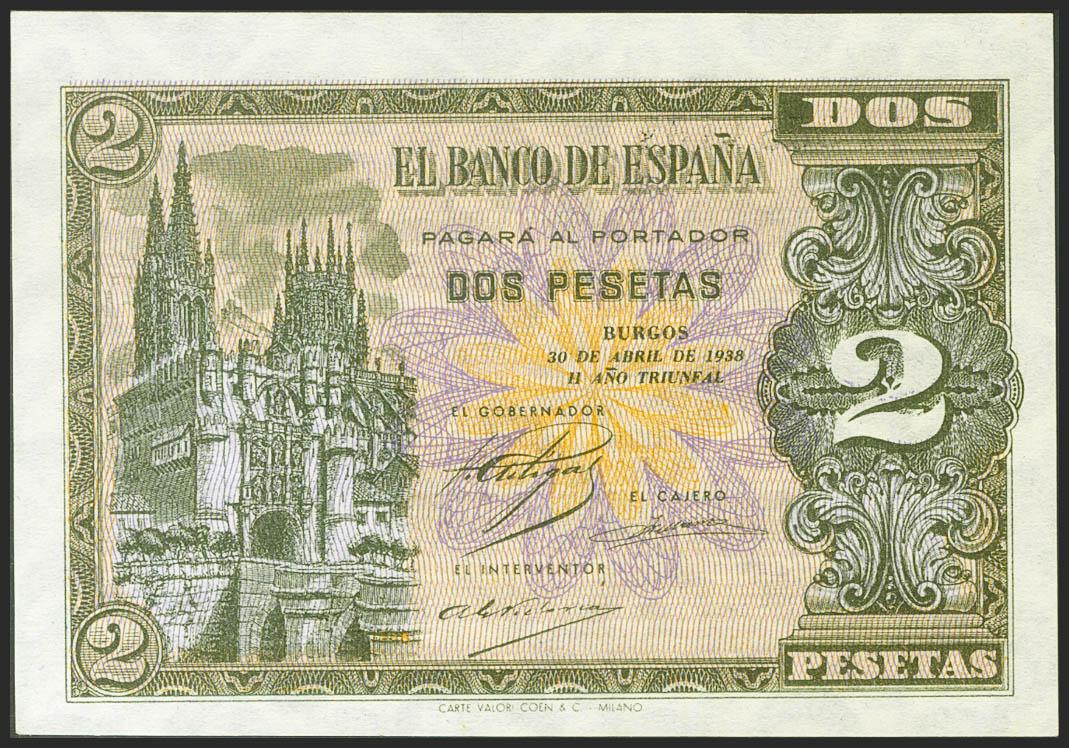 2 Pesetas. 30 de Abril de 1938. Serie I. (Edifil 2021: 429a). Apresto original. SC.