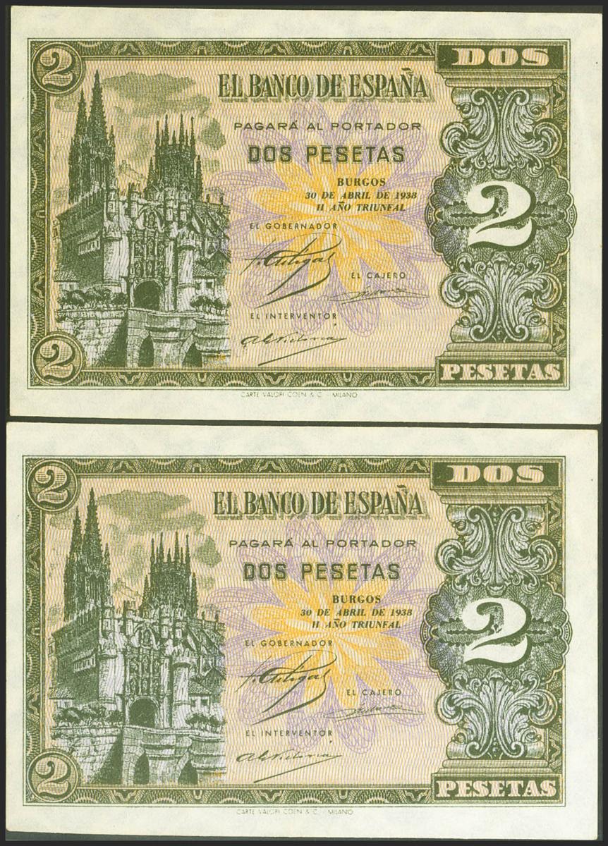 2 Pesetas. 30 de Abril de 1938. Pareja correlativa. Serie C. (Edifil 2021: 429a). Conserva todo su apresto original. SC-.