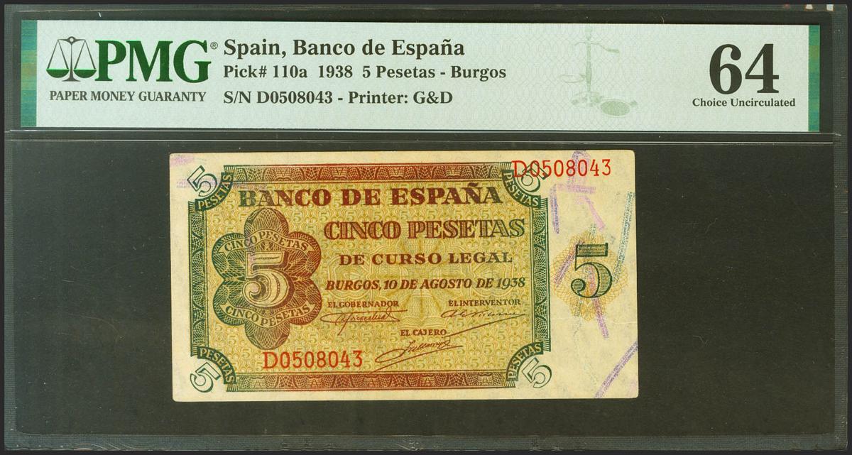 5 Pesetas. 10 de Agosto de 1938. Serie D. (Edifil 2021: 435a, Pick: 110a). SC. Encapsulado PMG64.