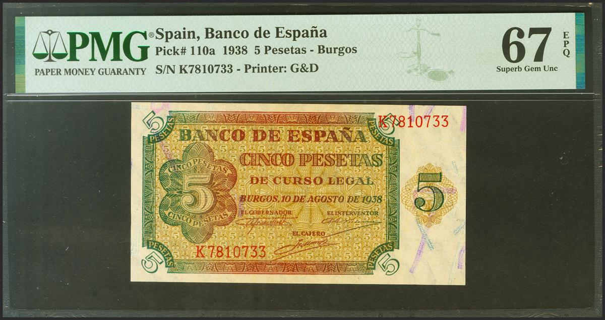 5 Pesetas. 10 de Agosto de 1938. Serie K. (Edifil 2021: 435a, Pick: 110a). Raro en esta excepcional calidad, apresto original. SC. Encapsulado PMG67EPQ.
