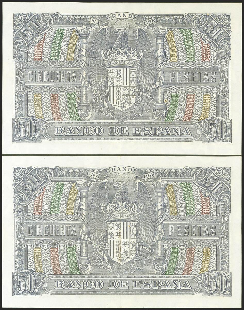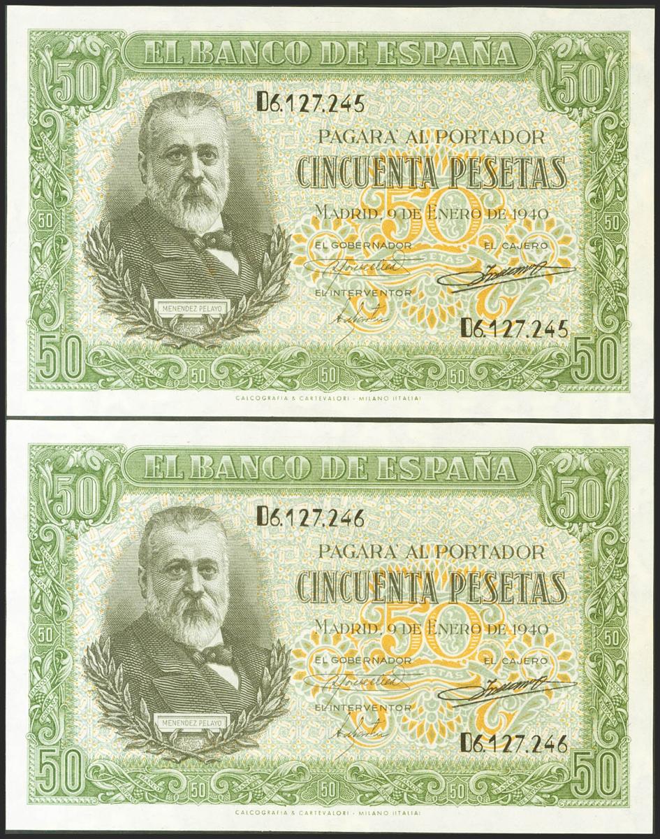 50 Pesetas. 9 de Enero de 1940. Pareja correlativa. Serie D. (Edifil 2021: 437a). Inusual, conserva gran parte de su apresto original. EBC.