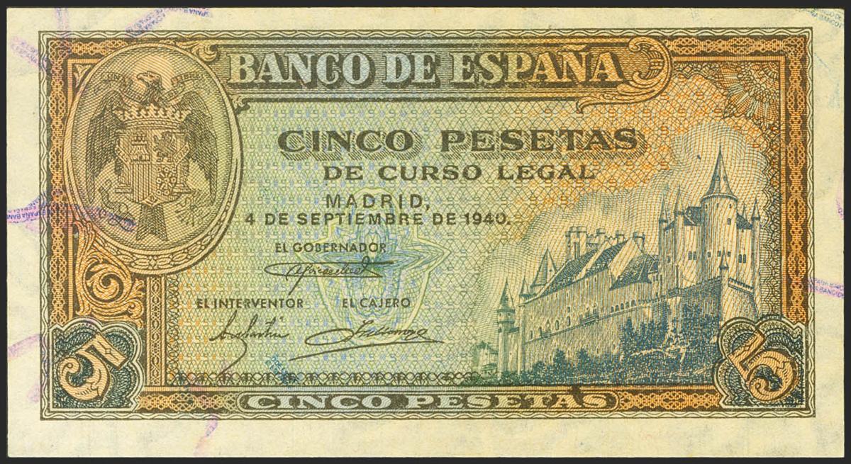 5 Pesetas. 4 de Septiembre de 1940. Serie G. (Edifil 2021: 443a). Conserva todo su apresto original. SC.