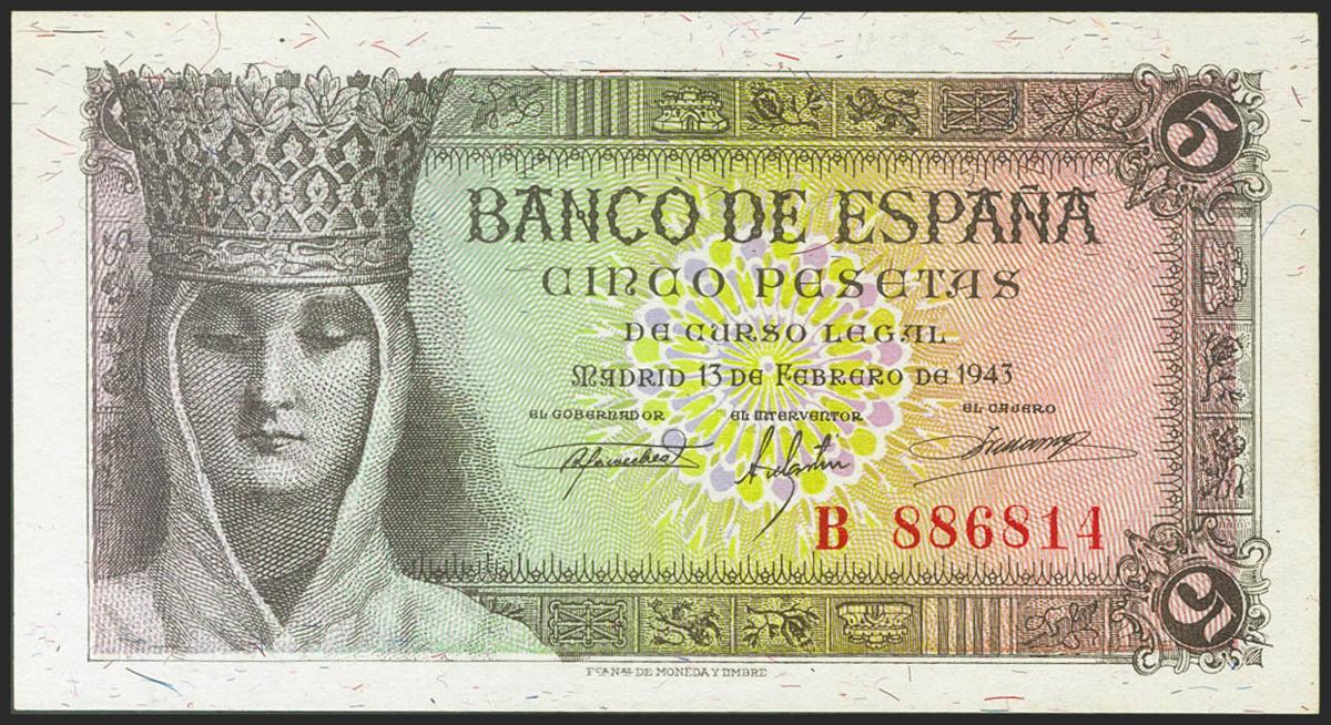 5 Pesetas. 13 de Febrero de 1943. Serie B. (Edifil 2021: 446a). Conserva gran parte de su apresto original. EBC++.