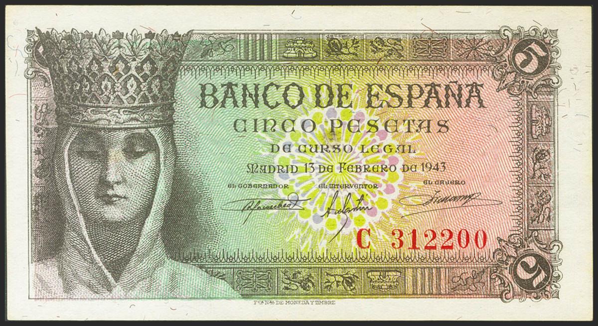 5 Pesetas. 13 de Febrero de 1943. Serie C. (Edifil 2021: 446a). Apresto original. SC-.