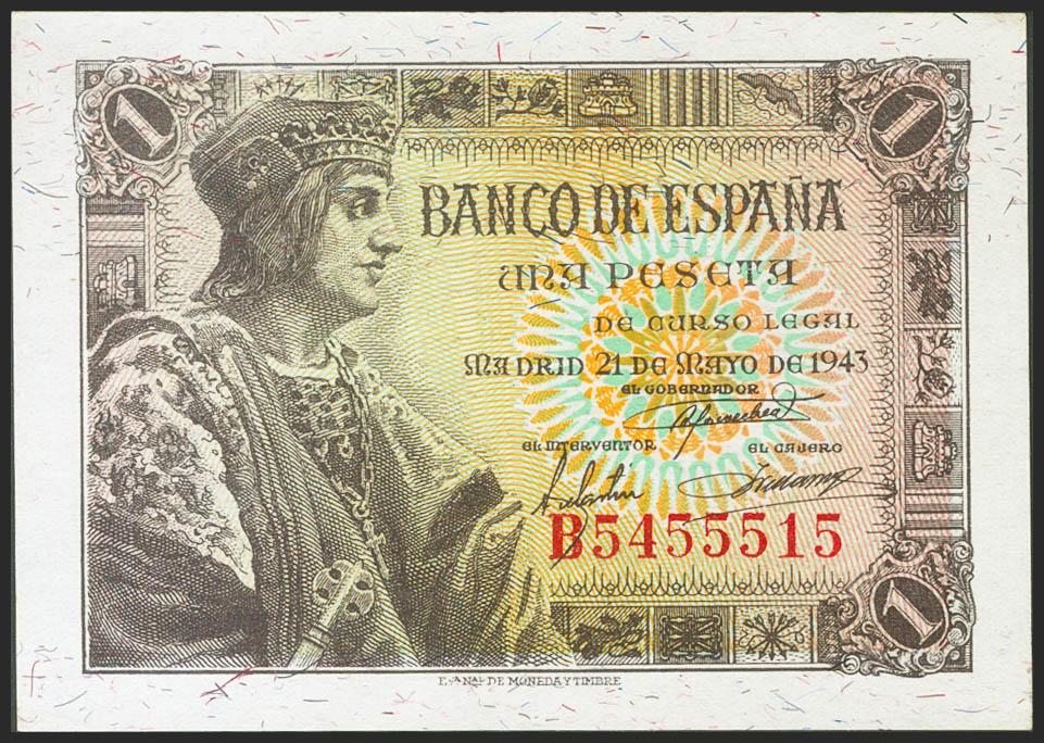 1 Peseta. 21 de Mayo de 1943. Serie B. (Edifil 2021: 447a). Apresto original. SC.