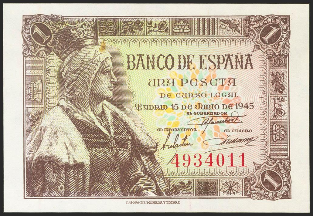 1 Peseta. 15 de Junio de 1945. Sin serie. (Edifil 2021: 448). Apresto original. SC-.