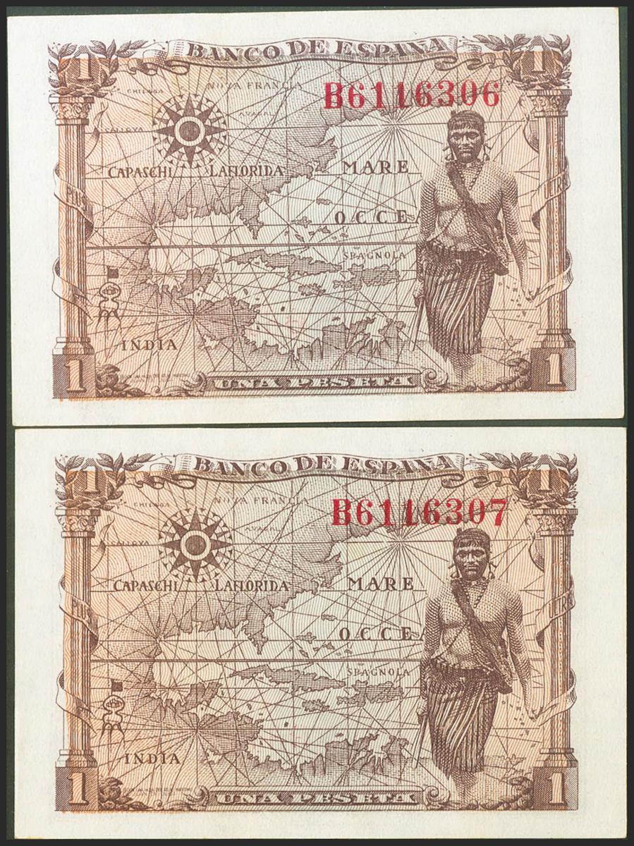 1 Peseta. 15 de Junio de 1945. Pareja correlativa. Serie B. (Edifil 2021: 448a). Apresto original. SC.
