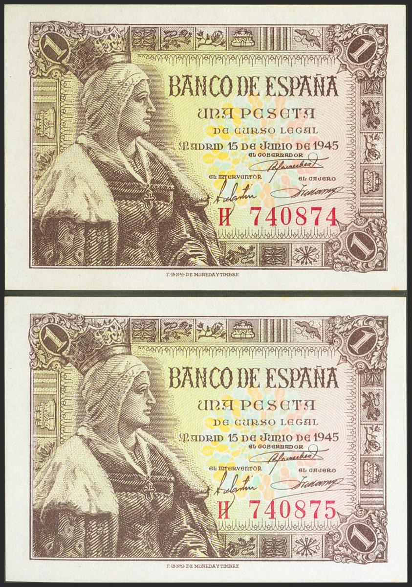 1 Peseta. 15 de Junio de 1945. Pareja correlativa. Serie H. (Edifil 2021: 448a). Apresto original. SC.