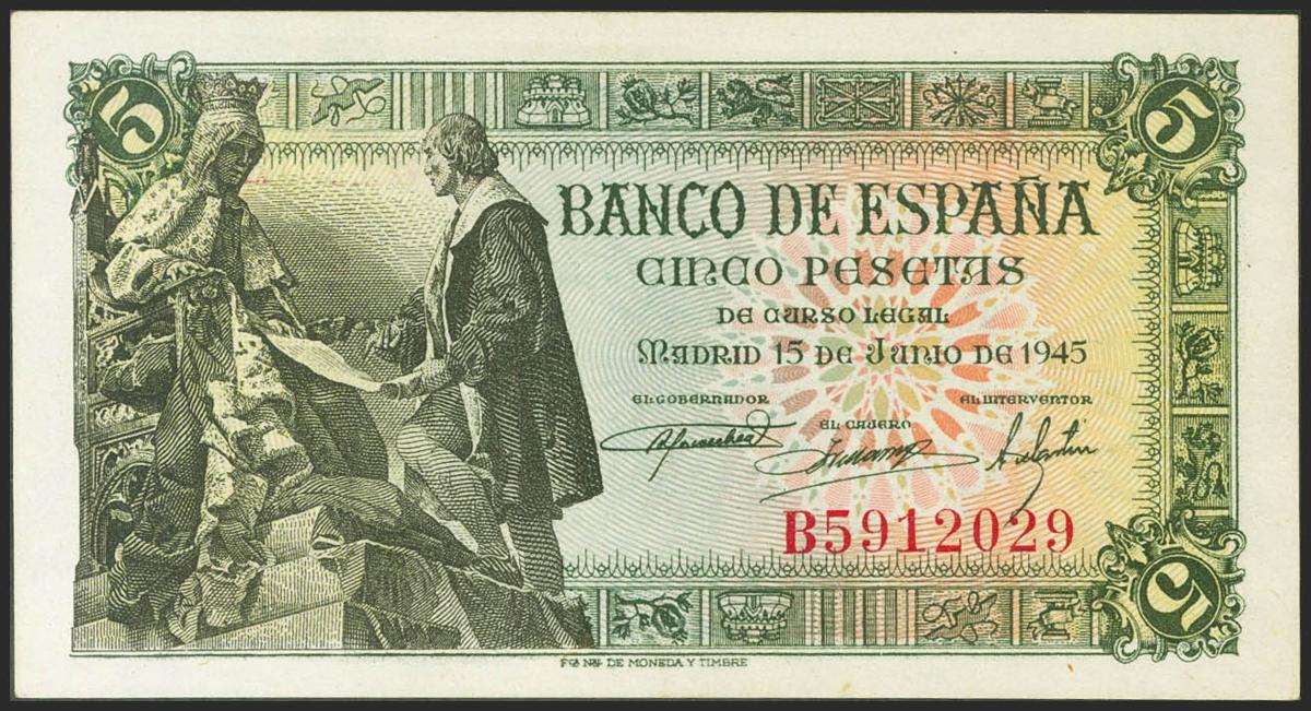 5 Pesetas. 15 de Junio de 1945. Serie B. (Edifil 2021: 449a). Apresto original. EBC++.