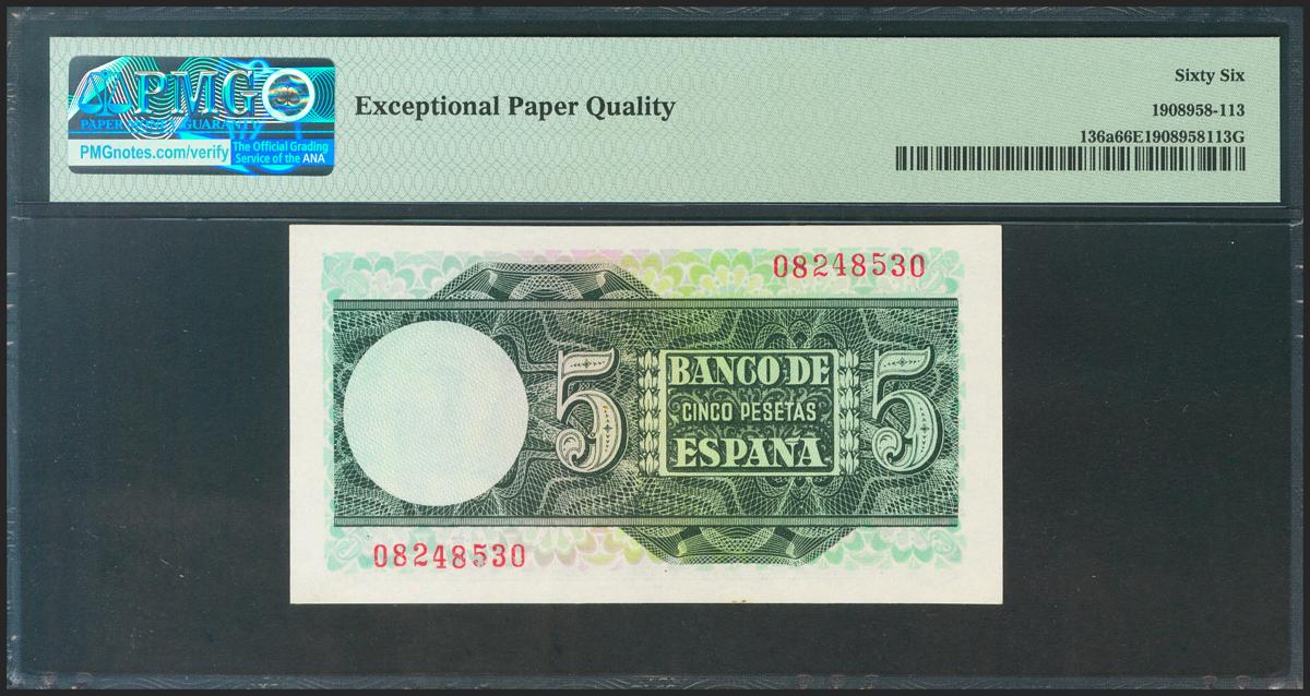 5 Pesetas. 15 de Marzo de 1948. Sin serie. (Edifil 2021: 455, Pick: 136a). Raro en esta calidad, apresto roiginal. SC. Encapsulado PMG66EPQ.