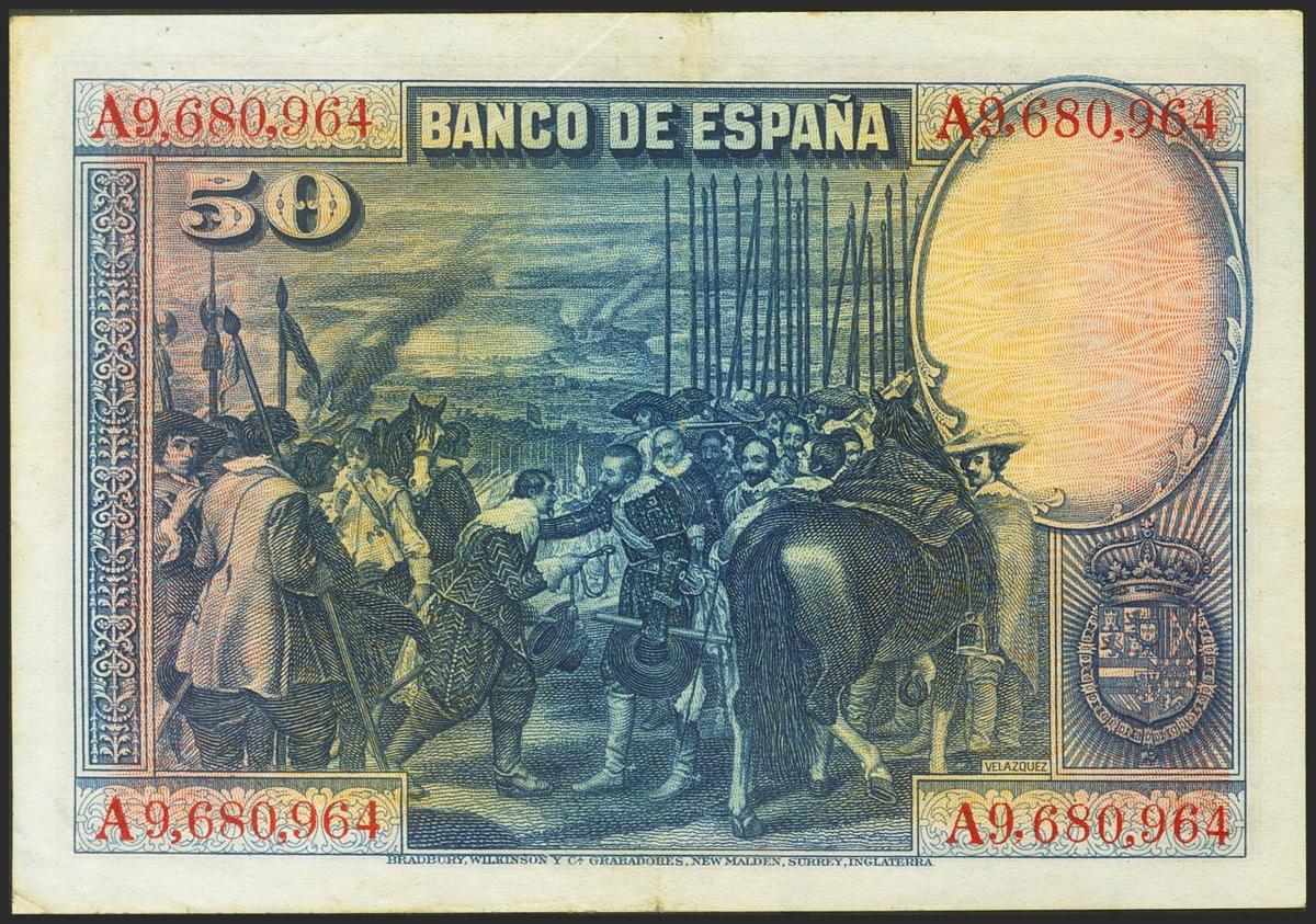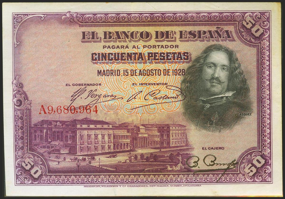 50 Pesetas. 15 de Agosto de 1928. Serie A y numeración posterior al 8640000. (Edifil 2021: 354). Apresto original, inusual serie. EBC.