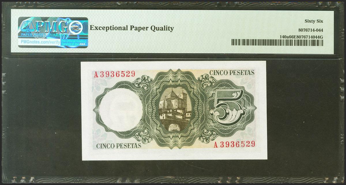 5 Pesetas. 16 de Agosto de 1951. Serie A. (Edifil 2021: 459a, Pick: 140a). Inusual en esta excepcional calidad, apresto original. SC. Encapsulado PMG66EPQ.