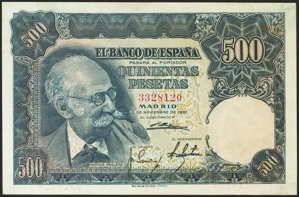 500 Pesetas. 15 de Noviembre de 1951. Sin serie. (Edifil 2021: 460). Conserva gran parte de su apresto original. EBC.
