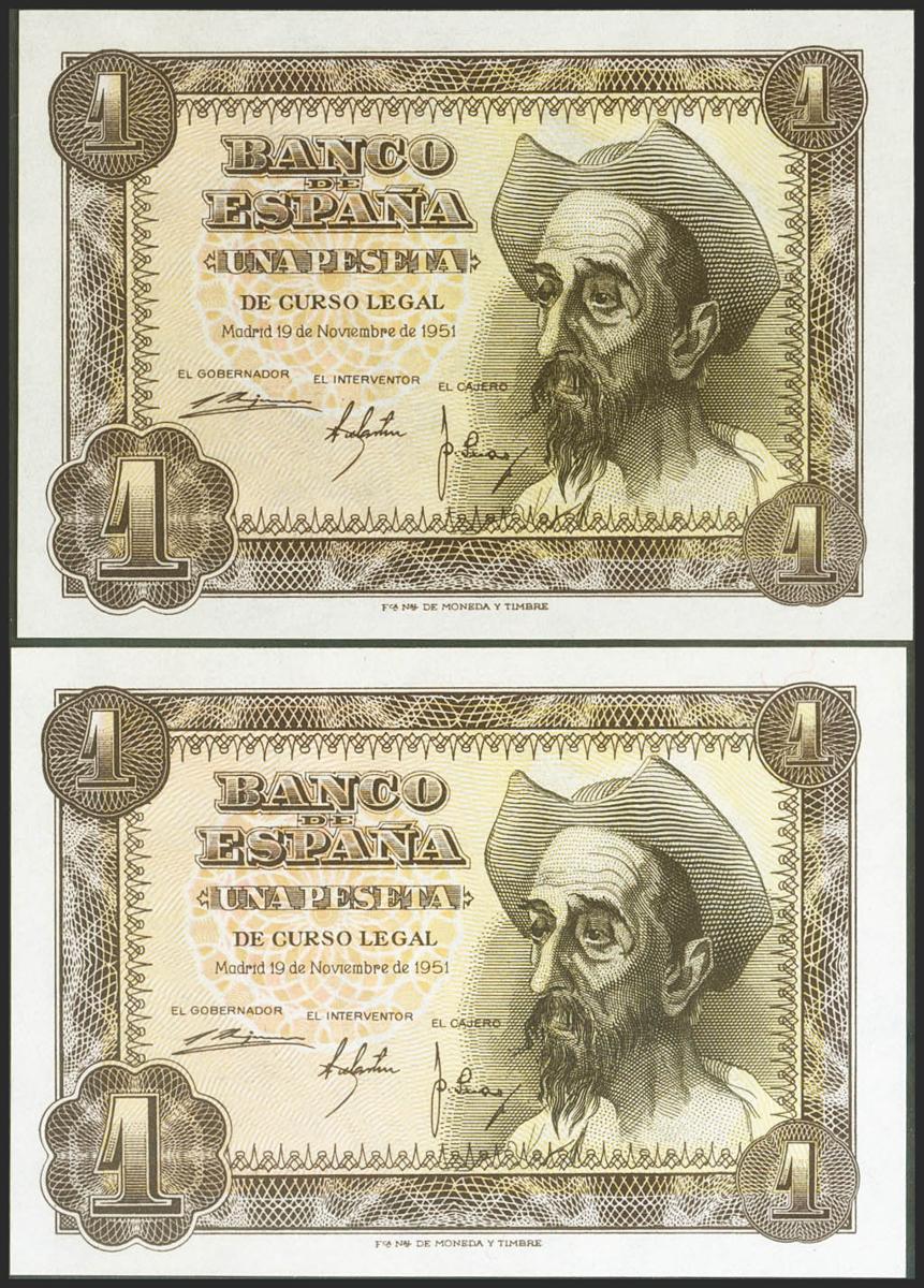 1 Peseta. 19 de Noviembre de 1951. Pareja correlativa. Serie H. (Edifil 2021: 461a). Apresto original. SC.
