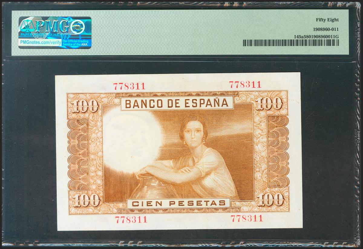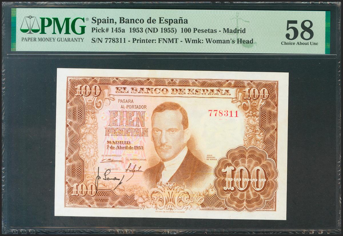 100 Pesetas. 7 de Abril de 1953. Sin serie. (Edifil 2021: 464, Pick: 145a). EBC++. Encapsulado PMG58.