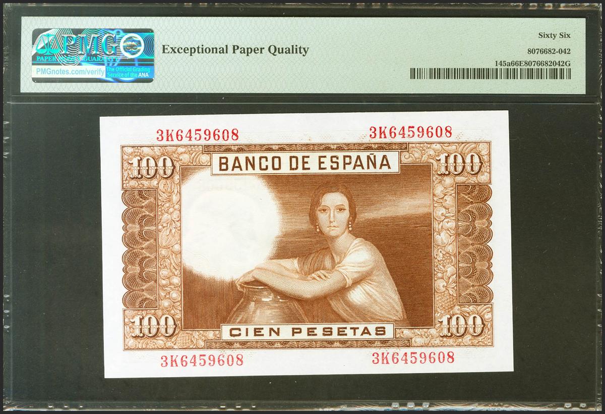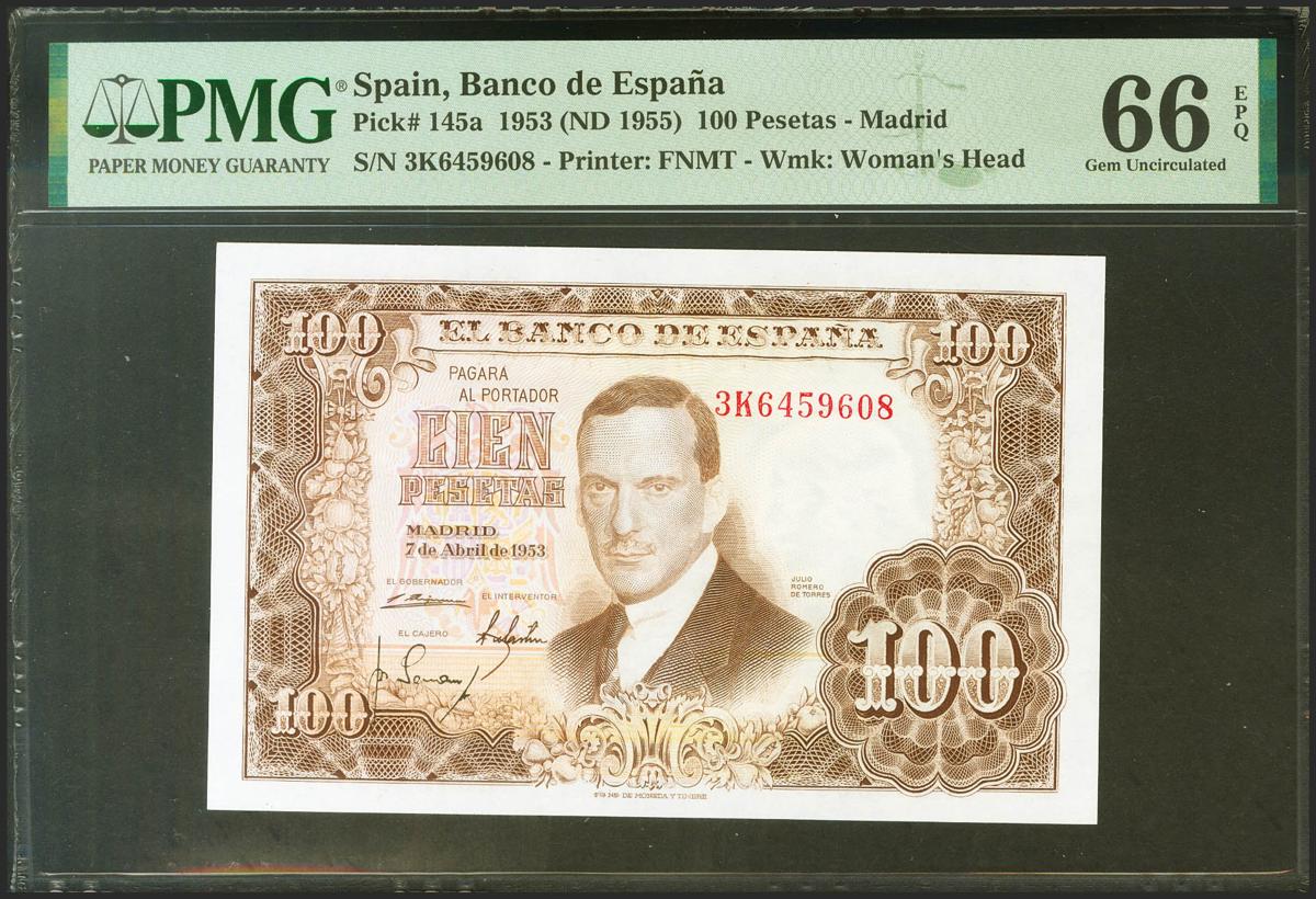 100 Pesetas. 7 de Abril de 1953. Serie 3K. (Edifil 2021: 464c, Pick: 145a). Inusual en esta excepcional calidad, apresto original. SC. Encapsulado PMG66EPQ.