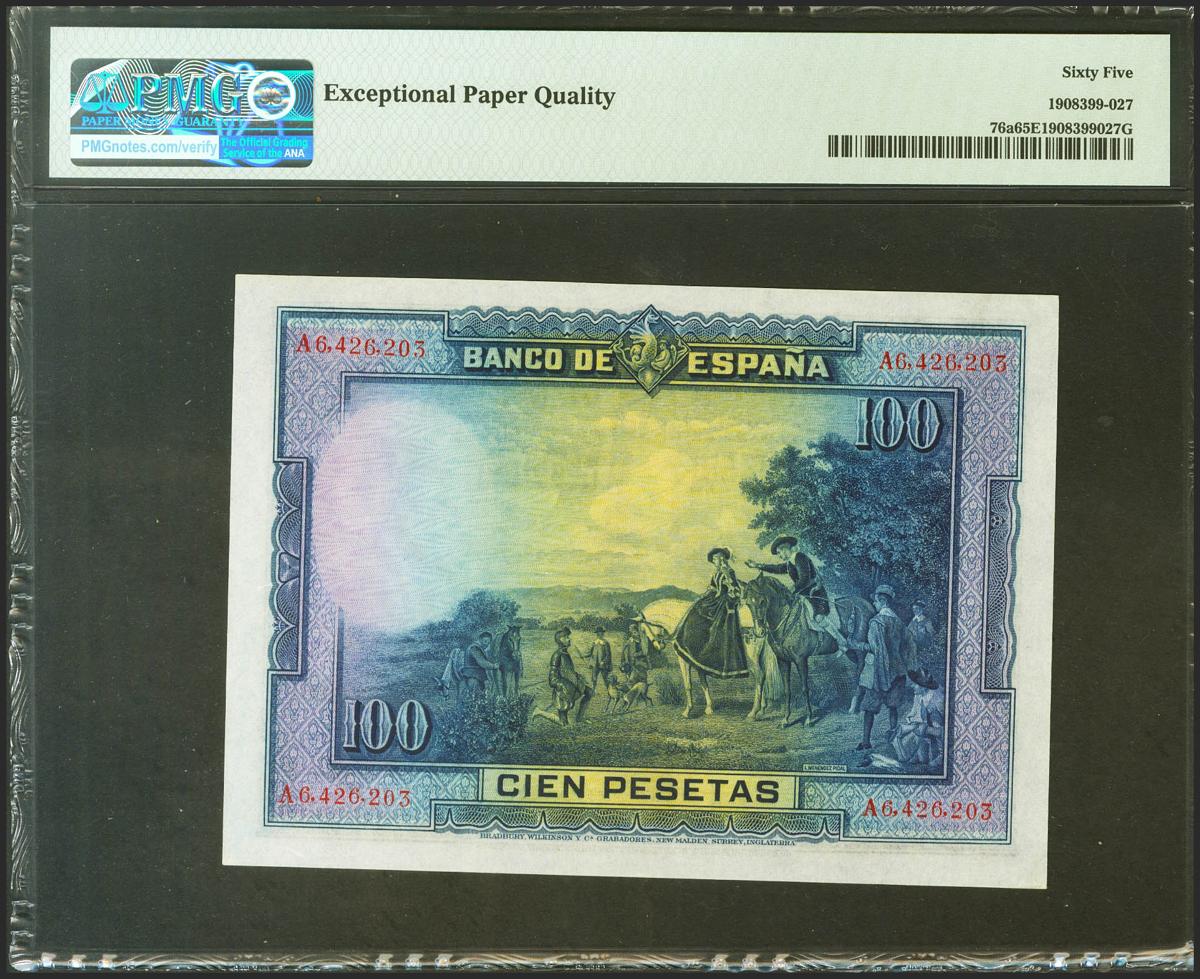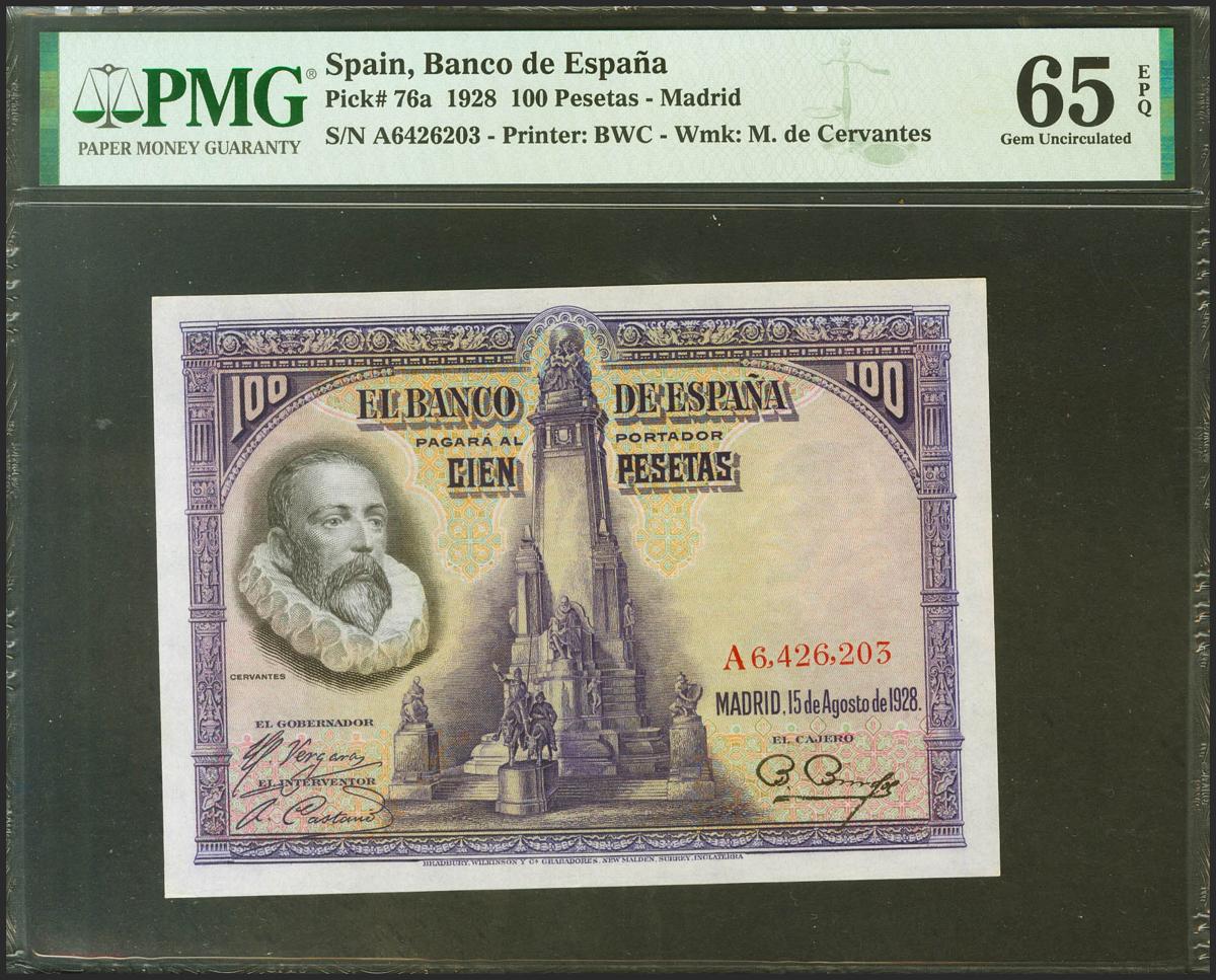 100 Pesetas. 15 de Agosto de 1928. Serie A. (Edifil 2021: 355a, Pick: 76a). Inusual en esta excepcional calidad, apresto original. SC. Encapsulado PMG65EPQ.