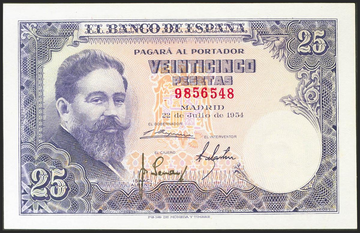 25 Pesetas. 22 de Julio de 1954. Sin serie. (Edifil 2021: 467). Conserva gran parte del apresto original. EBC++.