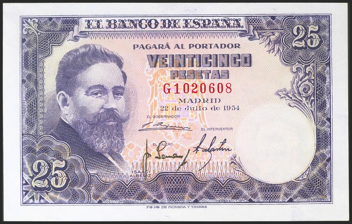 25 Pesetas. 22 de Julio de 1954. Serie G. (Edifil 2021: 467a). Conserva gran parte de su apresto original. EBC+.